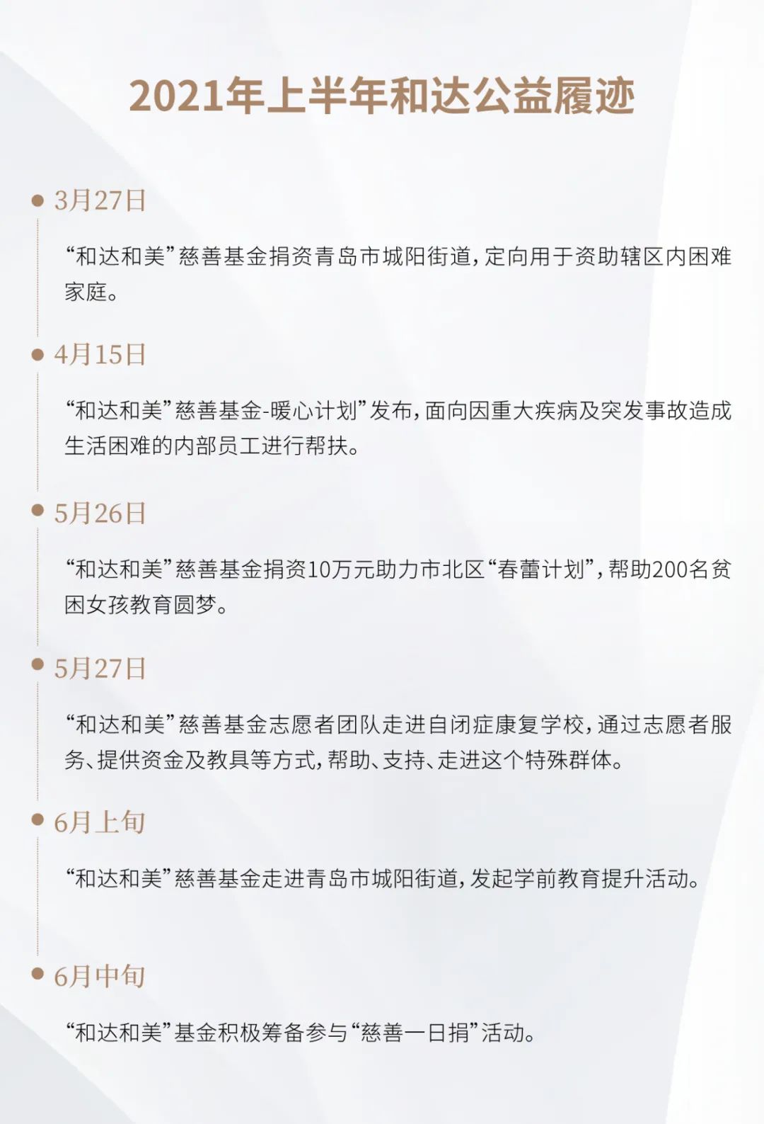 岁月不居,青秋代序。和达集团,28载踔厉奋发,心怀坚韧与美好,在时代浪潮中砥砺向前。在实现自身焕新迭变的同时,感恩时代赋予的机遇和社会各界的大力支持,坚守“和你共达美好”的孜孜追求,心系桑梓,和鸣城市共建之路,向善而行,将公益融入企业发展战略,以仁爱赤子之心,承企业责任担当。 公益不是百米冲刺,而是一场没有终点的马拉松。和达28年的拼搏奋斗路,也是一条稳健扎实的爱心公益路。为把公益做成一项长远、系统的项目,让慈善工作更加专业化、系统化、战略化,和达集团于2018年提出“千慈计划”,并在实践中不断完善,形成包含教育平权、成长助力、女性关爱、银发康养、绿色城市、多彩生活、人道救助七大慈善体系。2021年3月,和达集团联合青岛市慈善总会成立“和达和美”慈善基金,首次注资100万元用于2021年度公益活动的开展。至此,和达集团在公益道路上树起一座标志性意义的里程碑。“和达和美”基金以“专项计划+慈善基金”的专业慈善模式,通过资源整合、精准发力,不断提升公益覆盖面,提高帮扶效率,打造公益品牌。心怀善念,向善而行。2021上半年,“和达和美”慈善基金成立后,不断加大公益投入力度,通过教育提升、参与“春蕾计划”等方式让更多孩子接受良好教育,帮助困难家庭解决实际问题,在文化教育、人道救助、敬老慈幼等诸多领域持续贡献企业力量。